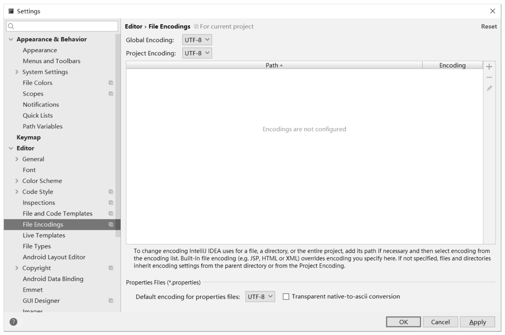 接着执行Editor→File Encodings命令,把所有可见范围内的编码(Encoding)全部设置为UTF-8。