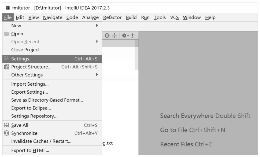 这样做的目的是在下一节讲述如何生成模组时,相关的编码将全部都是UTF-8的。然后打开IntelliJ IDEA,在菜单栏执行File→Settings命令。