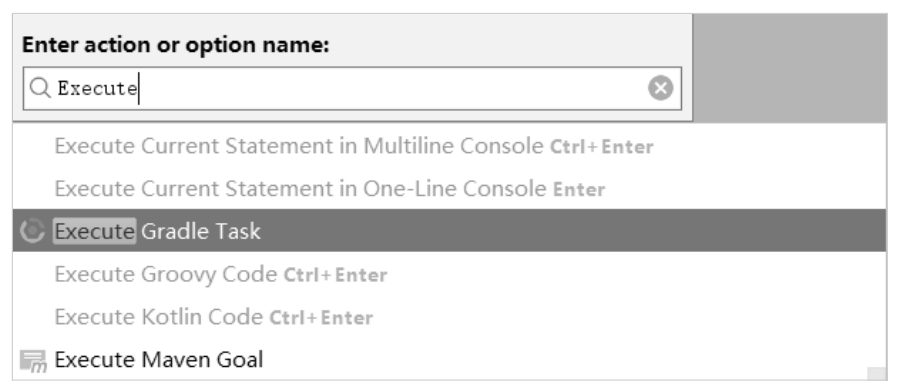 依赖控制台,除了使用命令行启动,也可以在IDE中启动。IntelliJ IDEA支持基于IDE本身直接执行相关任务,Eclipse的相关操作也应大同小异。按下Ctrl+Shift+A组合键,打开执行相关任务的选项框,并在搜索框中输入Execute并选择Execute Gradle Task(执行Gradle任务)。