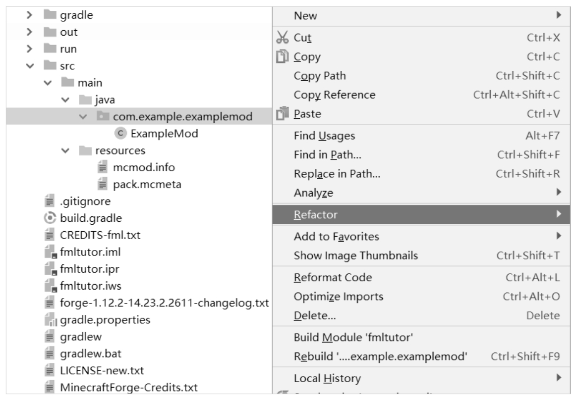 右击出现com.example.examplemod的地方,然后把鼠标移动到Refactor(重构)。