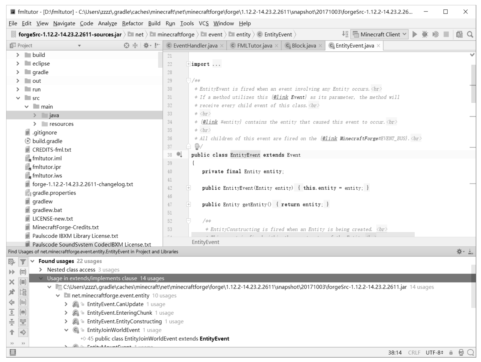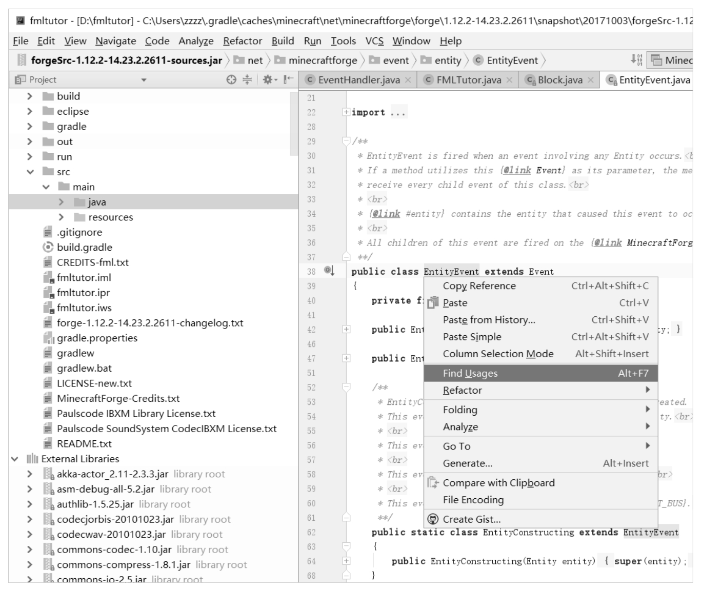 对于一个类本身,它只能继承一个类 ,不过它却可以被多个类继承,因此如果把所有的继承关系集合到一起,则可以形成一个 继承树 (Inheritance tree)。那么所有类是不是都是同一个类的子类(除了这个类本身)呢?答案是肯定的。对于所有声明中没有声明extends的类,Java规定,它们都将直接继承java.lang.Object类(除Object类本身),换言之, 除Object类本身之外,所有类都是Object类的子类 。Event的所有子类代表所有可以监听的事件。如果我们想看EntityEvent类都有哪些子类呢?在IntelliJ IDEA中,可以右击EntityEvent这个字符串,然后选择“Find Usages”(默认组合键是Alt+F7):