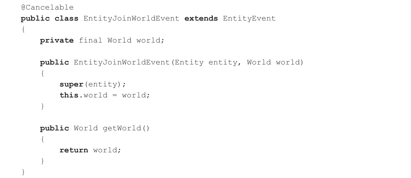 上述代码省去了import和package声明及注释之后的EntityJoinWorld Event类。读者可以通过按Ctrl键并单击EntityJoinWorldEvent后看到这段代码。
