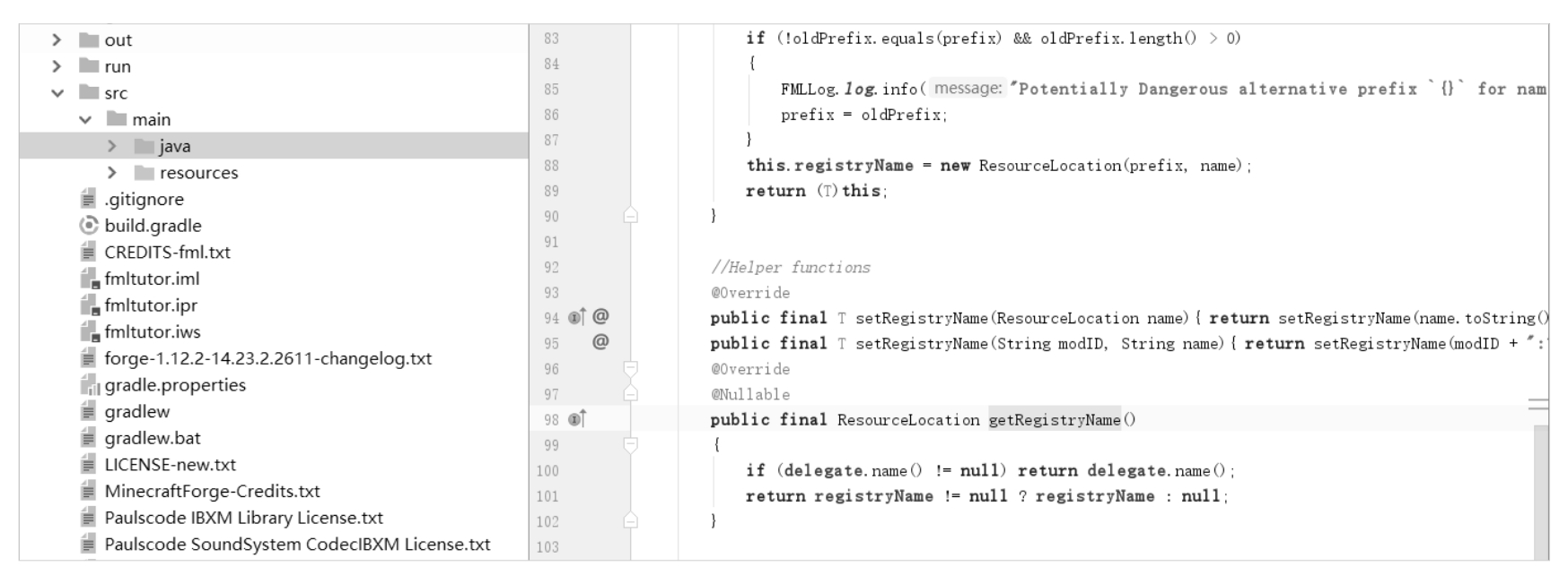 然后再回到Mod主类,把鼠标指针放在“getRegistryName”上,按Ctrl键并单击: