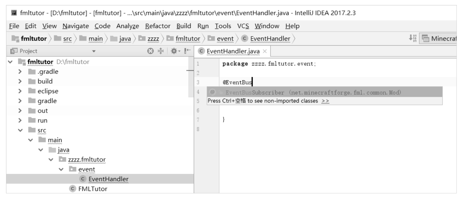 无论是IntelliJ IDEA还是Eclipse,都会提示有一个@EventBusSubscriber类,然后这时直接按Enter键。