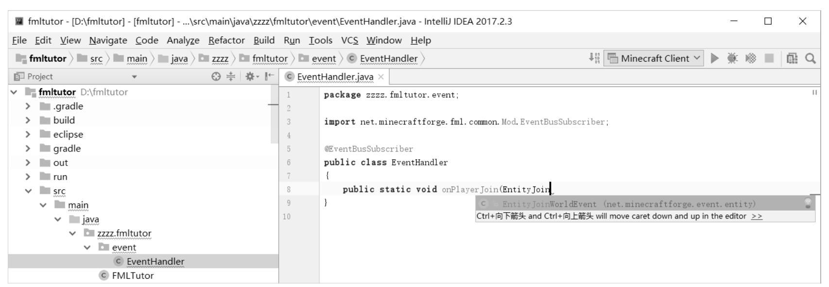 通过阅读代码可以猜到,我们监听了net.minecraftforge.event.entity.EntityJoinWorldEvent事件,从它的名字来看,就是实体加入世界时触发的事件。