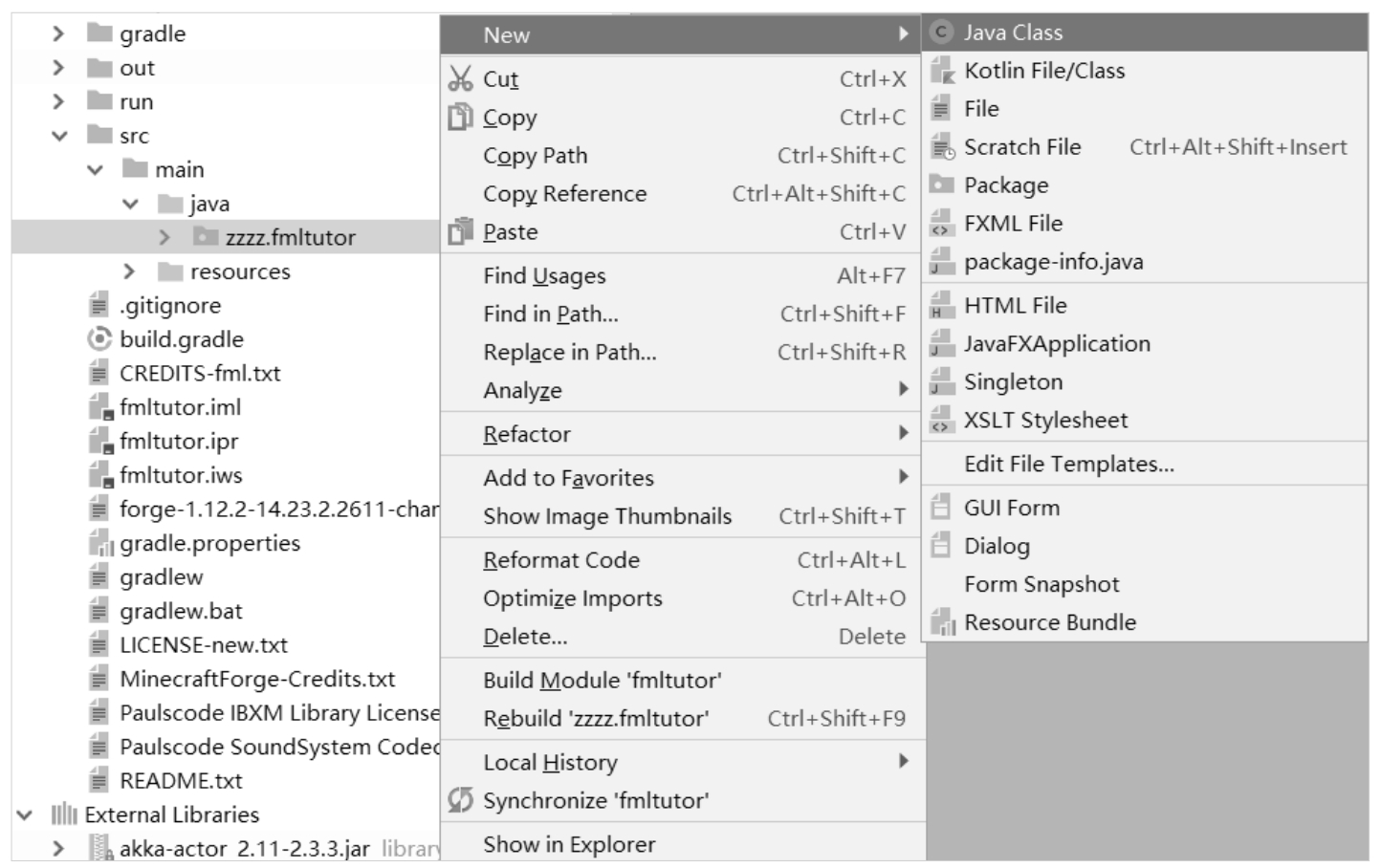 首先新建一个事件监听器类。右击zzzz.fmltutor这一包名,然后依次单击New→Java Class: