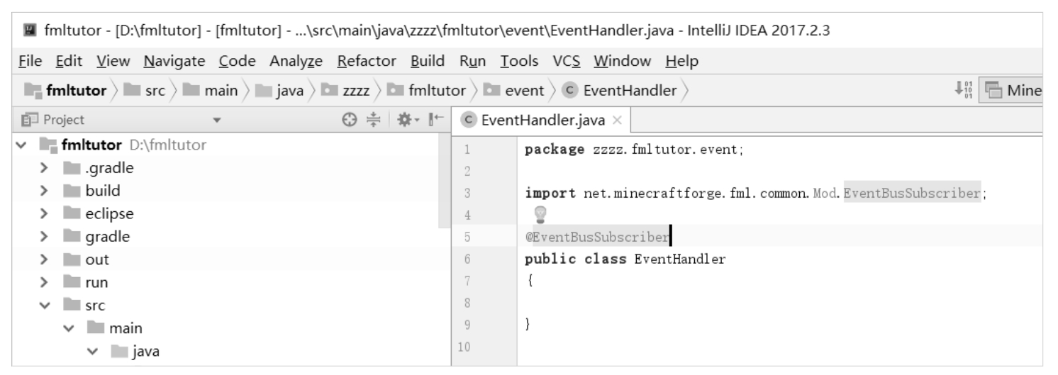 建立了一个名为zzzz.fmltutor.event的子包,并在其中建立了一个名为EventHandler的类。
