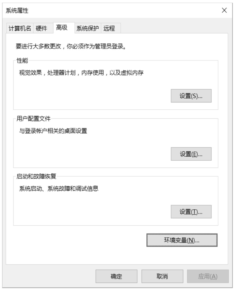 现在需要打开环境变量配置界面。如果读者使用Windows 10系统,那么可以右击“此电脑”,然后在弹出的菜单中选择“属性”→“高级系统设置”,然后在弹出的“系统属性”窗口中选择“环境变量”。