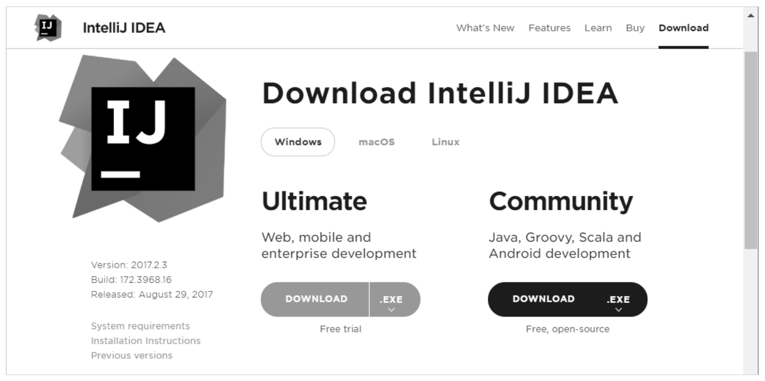 在IntelliJ IDEA的官方网站下载Community,即免费的社区版本就可以了。