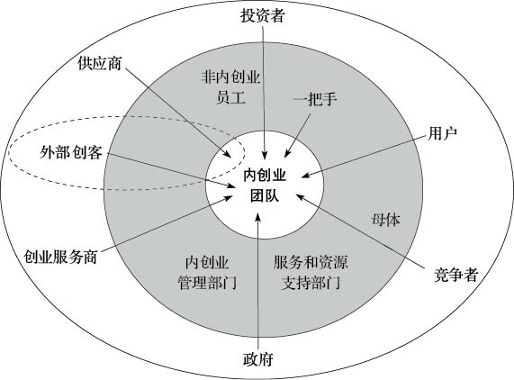 “一环”就是内创业团队,它位于整个生态圈的中心。团队成员既有内部员工,也有外部创客,这是内创业不同于社会化创业的一个方面。