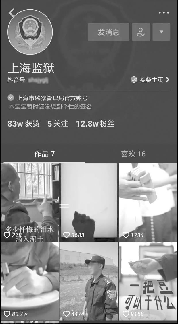 鉴于这样的现状,上海监狱率先开启了短视频账号(如图2-7所示),将其工作内容及生活场景以短视频的方式传递出来,狱警的日常训练场景与服刑人员的生活场景都立体化地展示出了这一特殊行政机构的面貌,也让人们对于监狱有了深度的了解与认知。