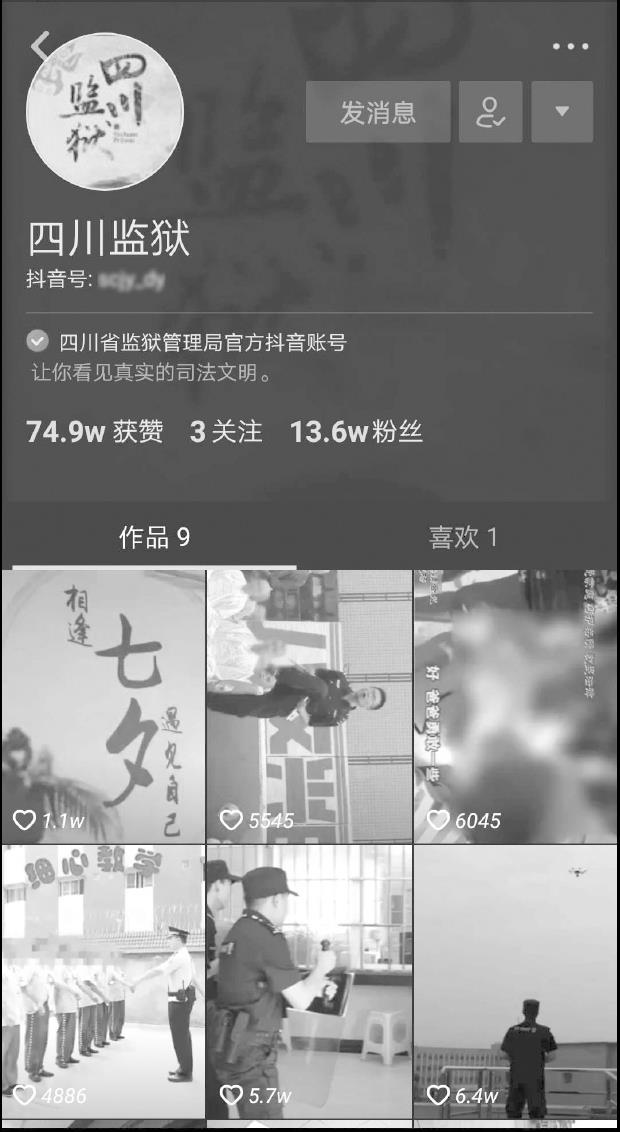 除了上海监狱开通了短视频账号,四川监狱、四川眉州监狱、新疆监狱纪检委员会等也开通了短视频账号。其中,四川监狱的短视频账号也运营得非常好(如图2-8所示),其内容以日常事务、狱警训练、服刑人员的活动为主,在常规内容之外,该账号偶尔也会发布一些搞笑内容,使得账号既有内容又不失幽默。截至2018年10月,该账号的关注量为13.6万,获赞74.9万。