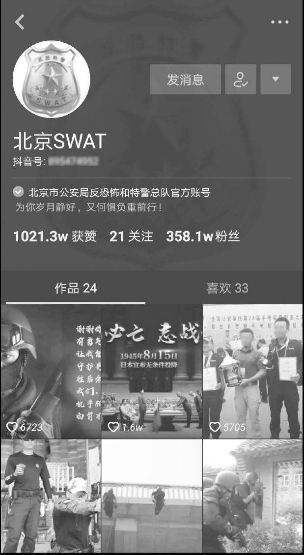 北京SWAT(如图2-4所示)是北京市公安局反恐怖和特警总队申请注册的抖音账号,它也是第一批入驻短视频平台的国家机构。截至2018年10月,该账号的关注量为358.1万,获赞1021.3万,这些数据不仅在政府机构和单位类型的账号中名列前茅,甚至在娱乐性账号中也属于佼佼者,体现了北京市公安局反恐怖和特警总队编辑运营团队的创意和构思,非常迎合新时代网络用户的喜好,让人们喜欢上观看和浏览这些原本呆板、枯燥的信息内容,同时也希望能够有越来越多的此类机构走出来,用这样的创意传递信息,让人们生活得更加安全、放心。