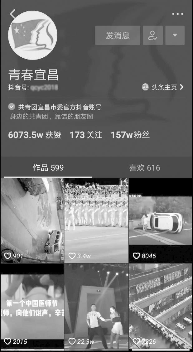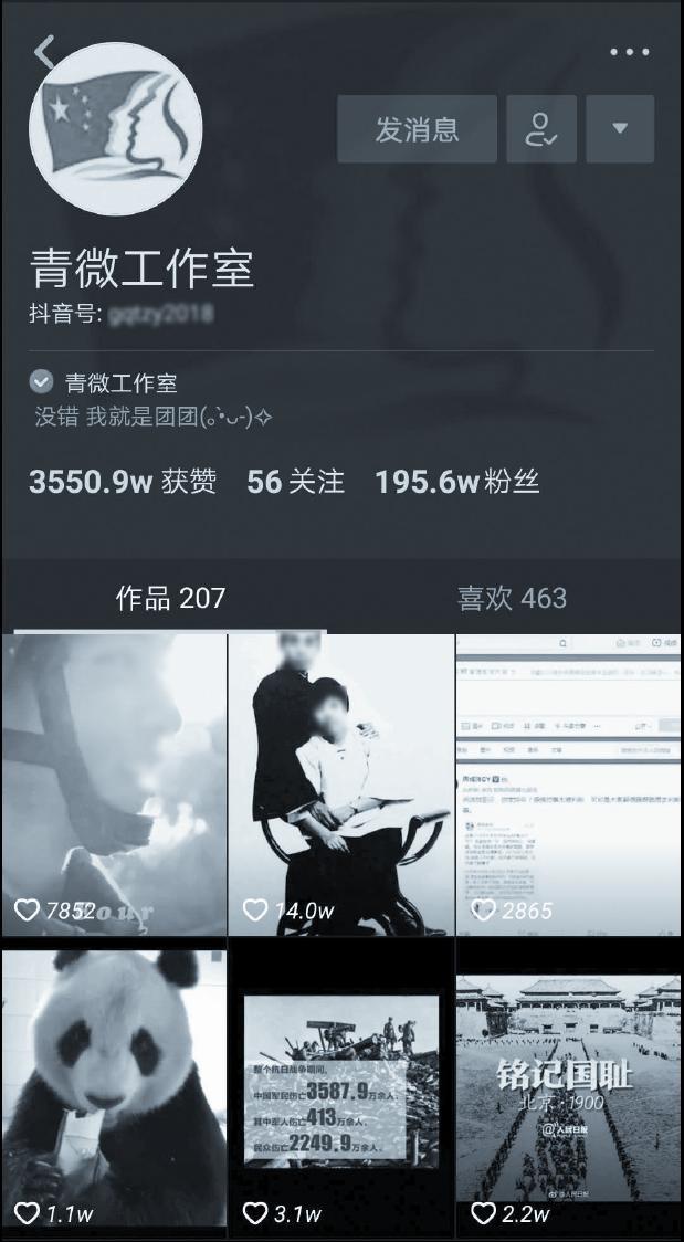 青微工作室(如图2-1所示)是由共青团中央申请开通的抖音账号,是第一批入驻短视频平台的国家机构,截至2018年10月,该账号已拥有195.6万的关注量,获赞3550.9万。