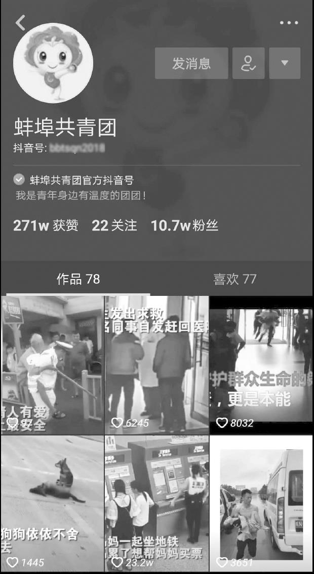 随着共青团中央的率先实践,越来越多的共青团分支机构开始入驻短视频平台,如共青团宜昌市委申请注册的抖音账号“青春宜昌”(如图2-2所示)、蚌埠市共青团申请注册的抖音账号“蚌埠共青团”(如图2-3所示)。虽然它们的关注量相对较少,但是这一行为是非常值得肯定与称赞的,它开启了政府机构新的信息传递方式的实践和探索,以及与大众的亲切交流互动,其所发布的内容都以传递正能量和温馨场景为主,偶尔穿插一些搞笑内容,在帮助人们树立正确、积极、向上的社会价值观的同时也不乏趣味性,提升了账号的吸引力,吸引了越来越多的关注者。