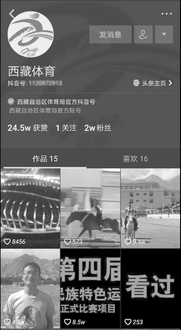 西藏体育是由西藏自治区体育局申请开通的抖音账号(如图2-10所示),截至2018年10月,该账号的关注量为2万,获赞24.5万。西藏作为一个较全国衡量比较落后的地区,其很多的新理念和新思想较全国来说也比较滞后,在这种特殊情况下,西藏自治区体育局能够积极主动地转变理念,接受新事物并开通短视频这一当下流行的新媒体传播渠道,是非常值得称赞的。