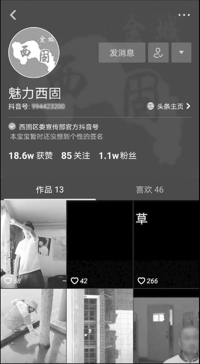 魅力西固是由甘肃省兰州市西固区党委组织部运营的抖音账号(如图2-9所示),虽然其运营数据较其他账号差距较大,但其是以我国领导组织——中国共产党委员会地区支委为经营主体而申请开通的,代表着中国共产党在新时代背景下的亲民路线与传播理念,具有特殊意义。