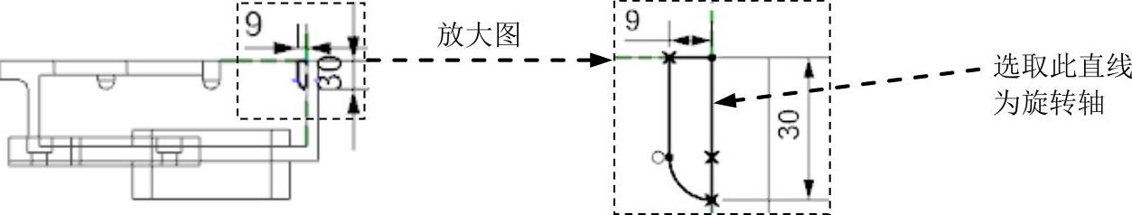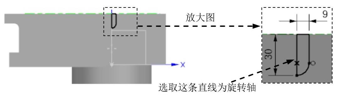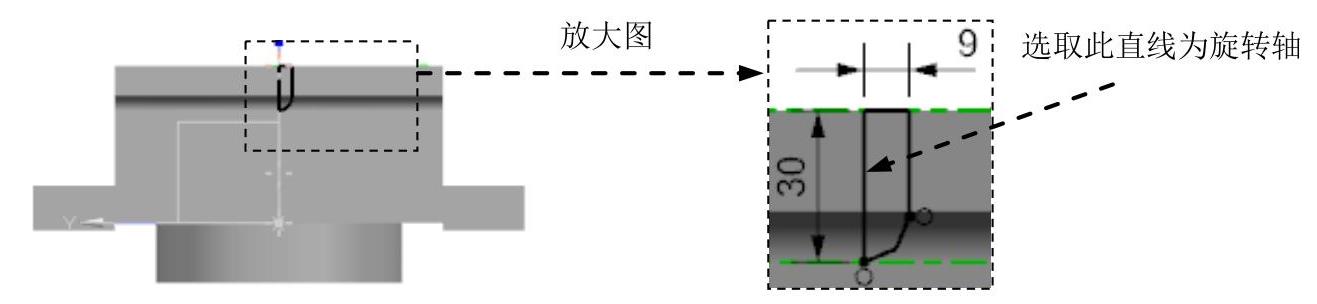 按钮,在绘图区选取图2.7.30所示的平面为草图平面,绘制图2.7.31所示的截面草图。在绘图区中选取图2.7.31所示的直线为旋转轴。在“旋转”对话框