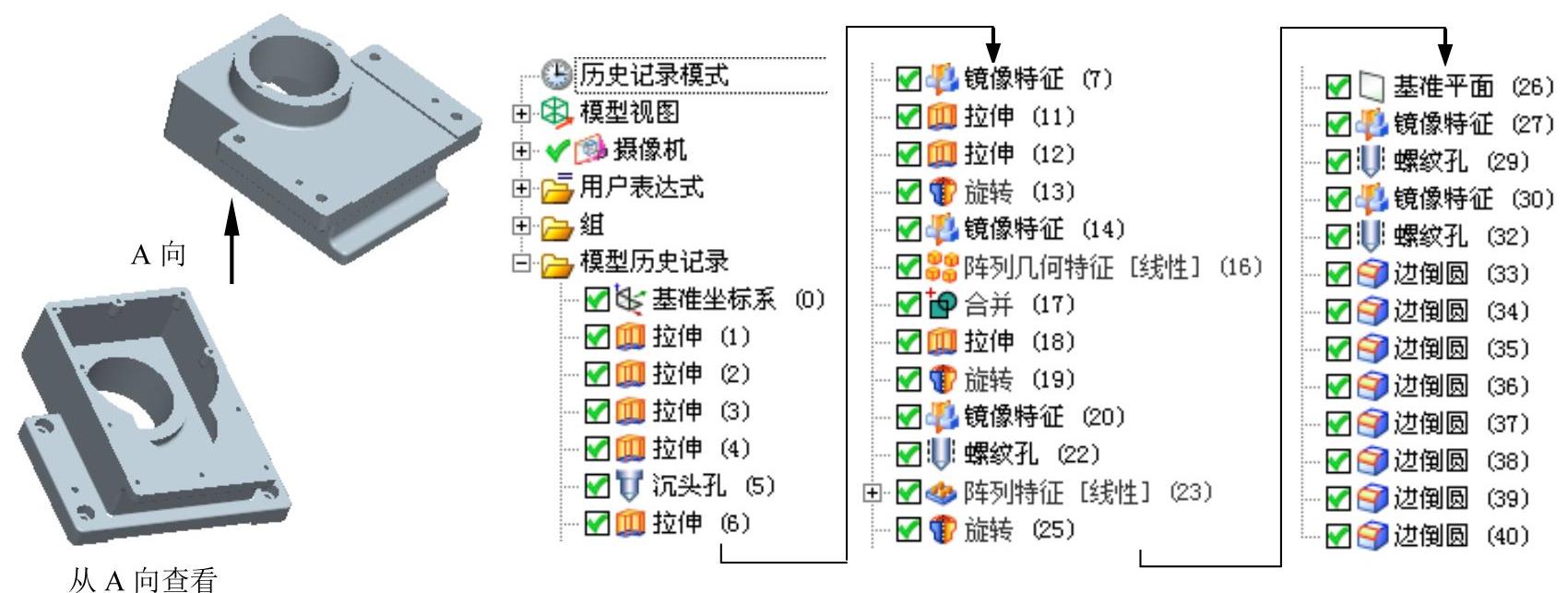 本实例的设计过程中充分利用了“孔”“阵列”和“镜像”等命令,在进行截面草图绘制的过程中,要注意草绘平面的选择。泵箱的零件模型及模型树如图2.7.1所示。