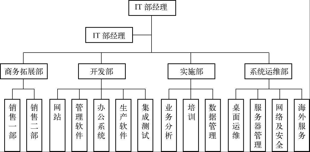 目标清楚了,小付有些兴奋。以前做的项目是一两个在企业应用的软件系统,这次要面对一个集团公司整个IT部门的业务规划。小付研究了IT部的组织机构:一百来号人,开发部、实施部、系统运维部,还有商务拓展部。开发部还包括好几个产品线——网站、ERP、LOTUS,还有一些行业专用的软件系统。同时,公司网络覆盖国内多个省(自治区、直辖市)以及几个海外办事处,如图2-1所示。