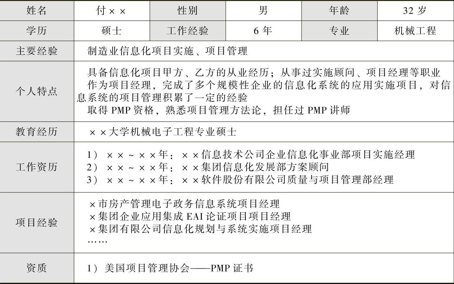 小付学机械工程专业出身(表2-1),研究生毕业时正值计算机与网络科技炙手可热、制造业信息化迅速发展之时,小付义无反顾地投身制造业信息化领域。虽然不是计算机专业出身,但作为实施顾问干得挺顺利,因为系统的应用客户基本都来自制造业,小付的制造专业背景发挥了作用。小付所负责的系统实施,主要从企业的产品研发、制造等业务环节对业务进行梳理,帮助客户运用软件系统提升业务活动与业务流程的质量与效率。