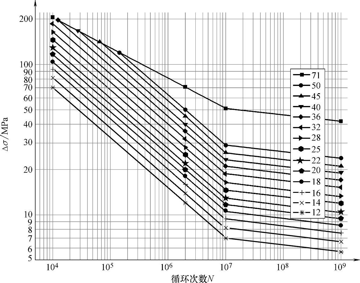 图4-4给出了IIW标准铝合金焊接接头的 S-N 曲线族,疲劳等级从FAT=71到FAT=12, S-N 曲线的常数及常幅疲劳极限和截止极限与表4-3类似。