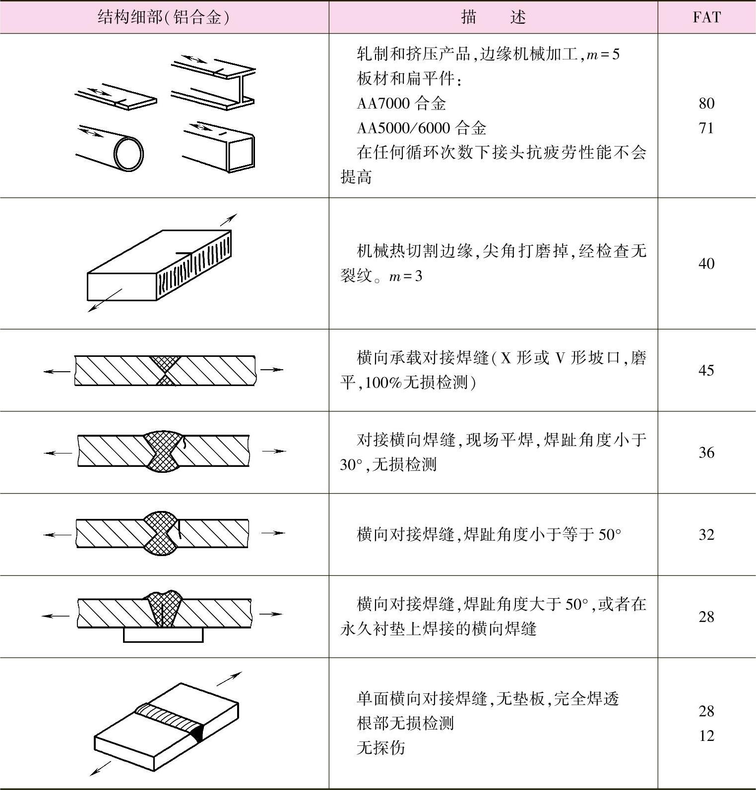 铝焊接结构的疲劳强度设计与结构钢的步骤相同,首先需要提供 S-N 曲线数据,IIW标准提供了一些分级的铝合金焊接接头的 S-N 曲线数据,表4-4是IIW标准中部分铝焊接接头等级分类 [3] 。