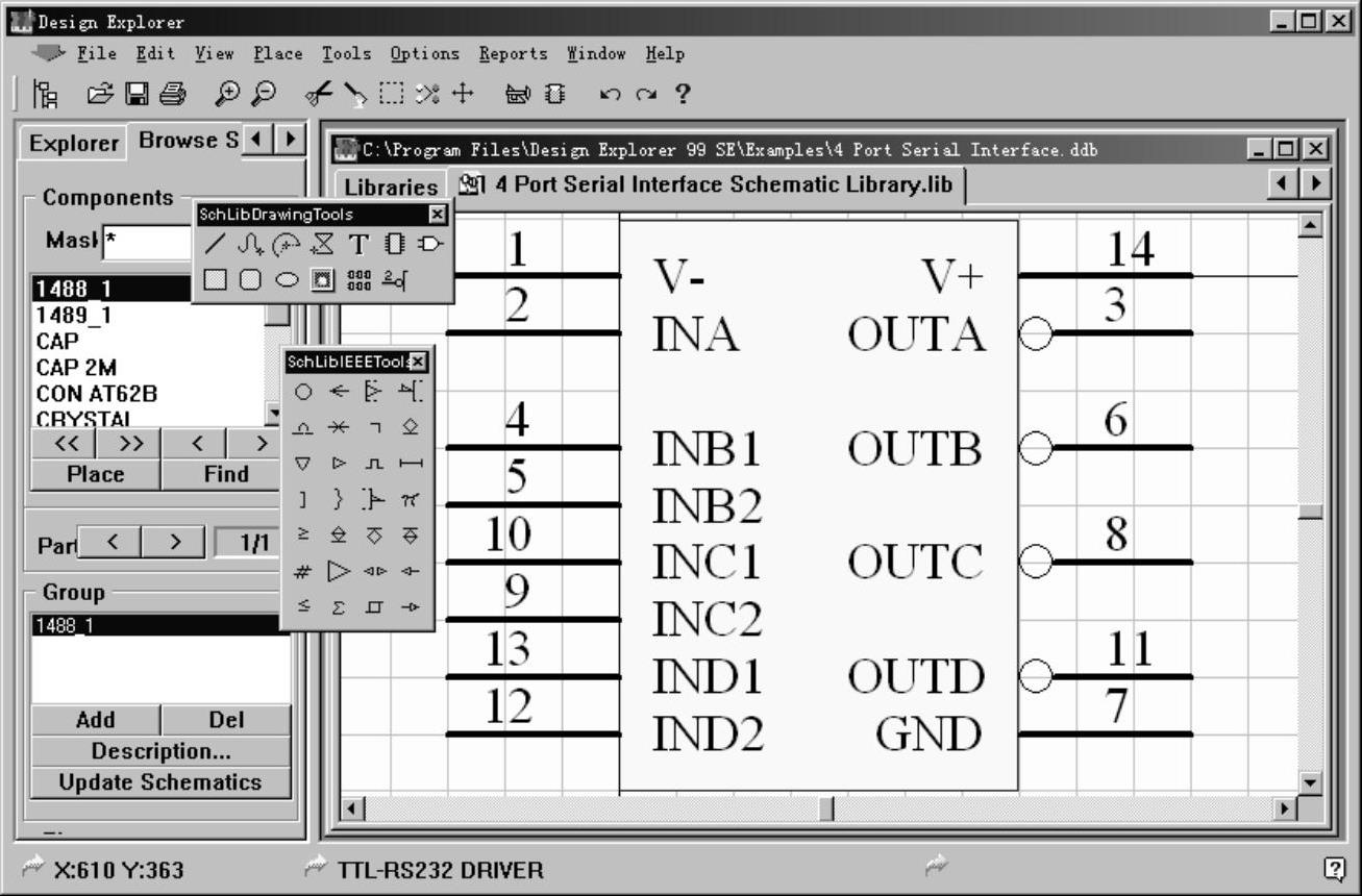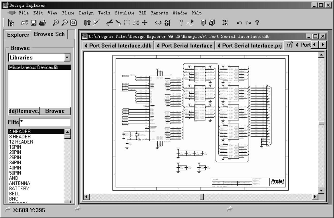 原理图编辑是电路计算机辅助设计的前提,首先完成原理图的编辑工作。原理图编辑界面如图1-23所示。Protel 99 SE的原理图编辑采用了标准的图形化编辑方式,用户能够非常直观地控制整个编辑过程。在原理图编辑器中,用户可以实现Windows的一些普通编辑操作,如复制、剪切、粘贴等。编辑器中采用了交互式的编辑方法,在编辑对象属性时,用户只需要在所需编辑的对象上双击鼠标,即可打开对象属性对话框,直接对其进行修改,非常直观、方便。