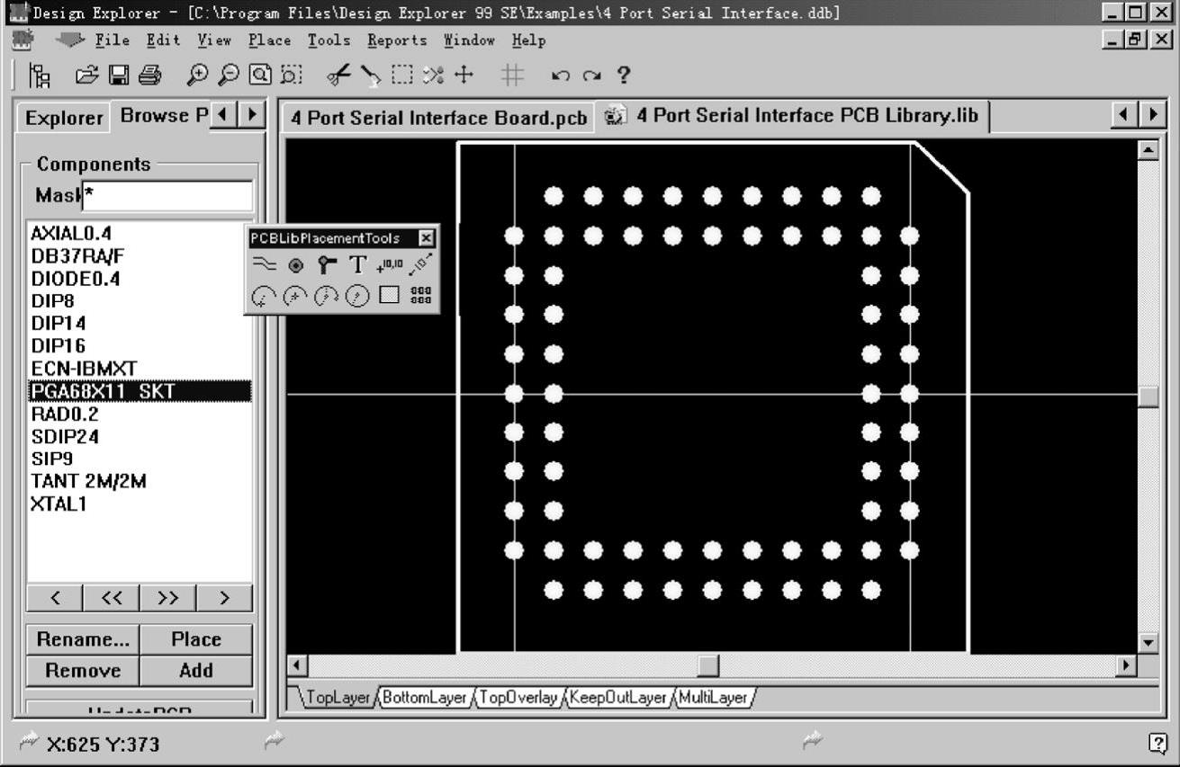 如果在PCB设计过程中,当某一元器件的封装图在Protel 99 SE已有的元器件封装库中找不到时,则需要进入元器件封装图编辑器制作需要的元器件封装图。元器件封装的编辑器界面,如图1-26所示。Protel 99 SE也提供了众多常见的PCB元器件封装,用户可以通过加载这些库文件方便地使用,同时也具备完善的库元器件管理功能,用户可以通过多种方式方便快速地创建一个新的PCB元器件封装。