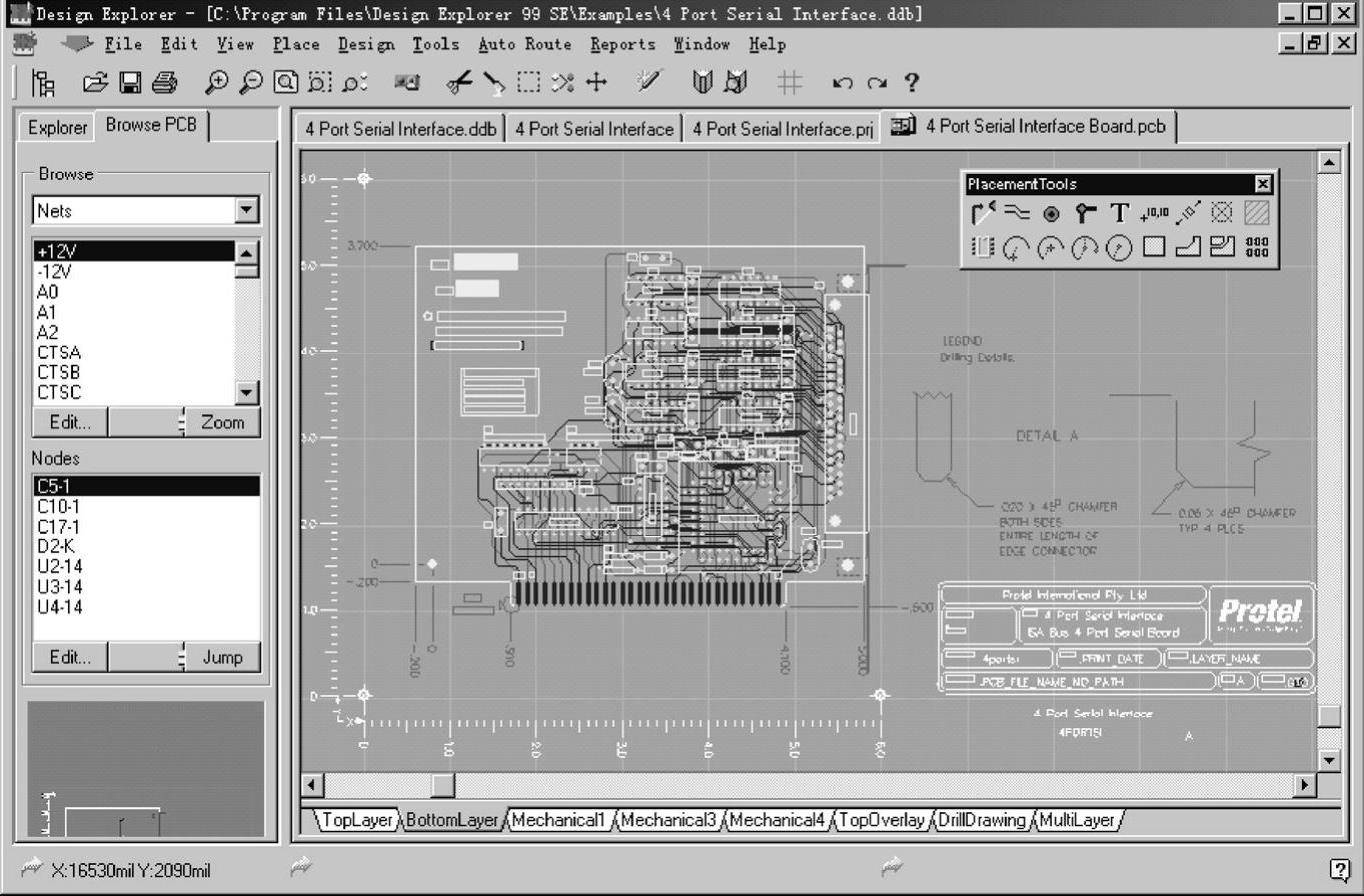 接下来完成布局布线的任务。Protel 99 SE有一些极好的手动布线特性,包括绕障碍(slam-and-jam)方式,能够自动地弯折线,并与设计规则完全一致,结合拖拉线时自动抓取实体电气网格特性和预测放线特性,能够在很理想的网格上有效地布置出带有混合元器件技术的复杂板。Protel 99 SE还提供功能强大的自动布线功能,实现设计的自动化。