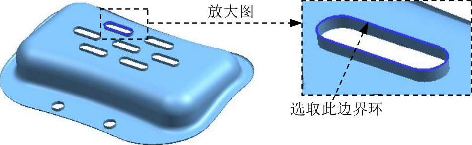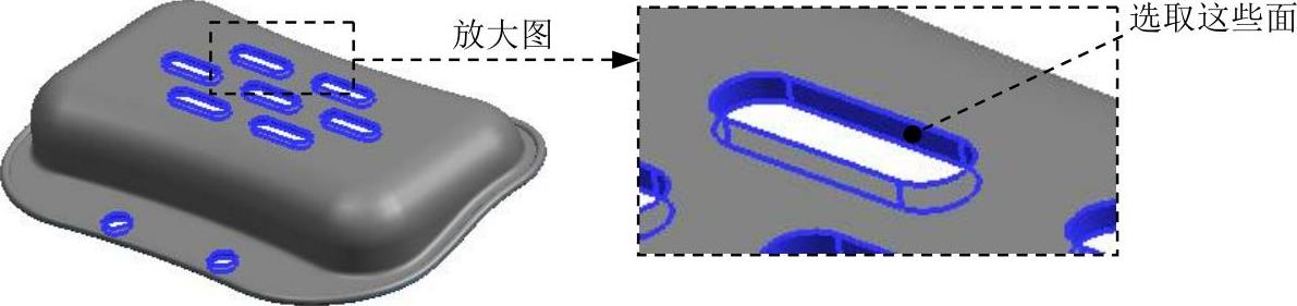 复选框,其他参数采用系统默认设置值;选取如图1.28所示的所有破孔侧面(共30个面)为抽取对象;单击