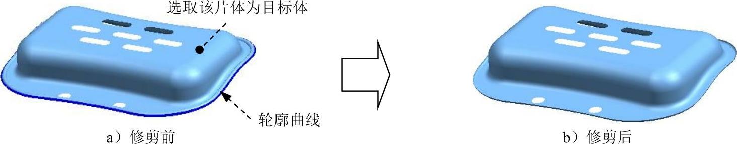 按钮,完成片体的修剪,如图1.27b所示(隐藏轮廓曲线)。