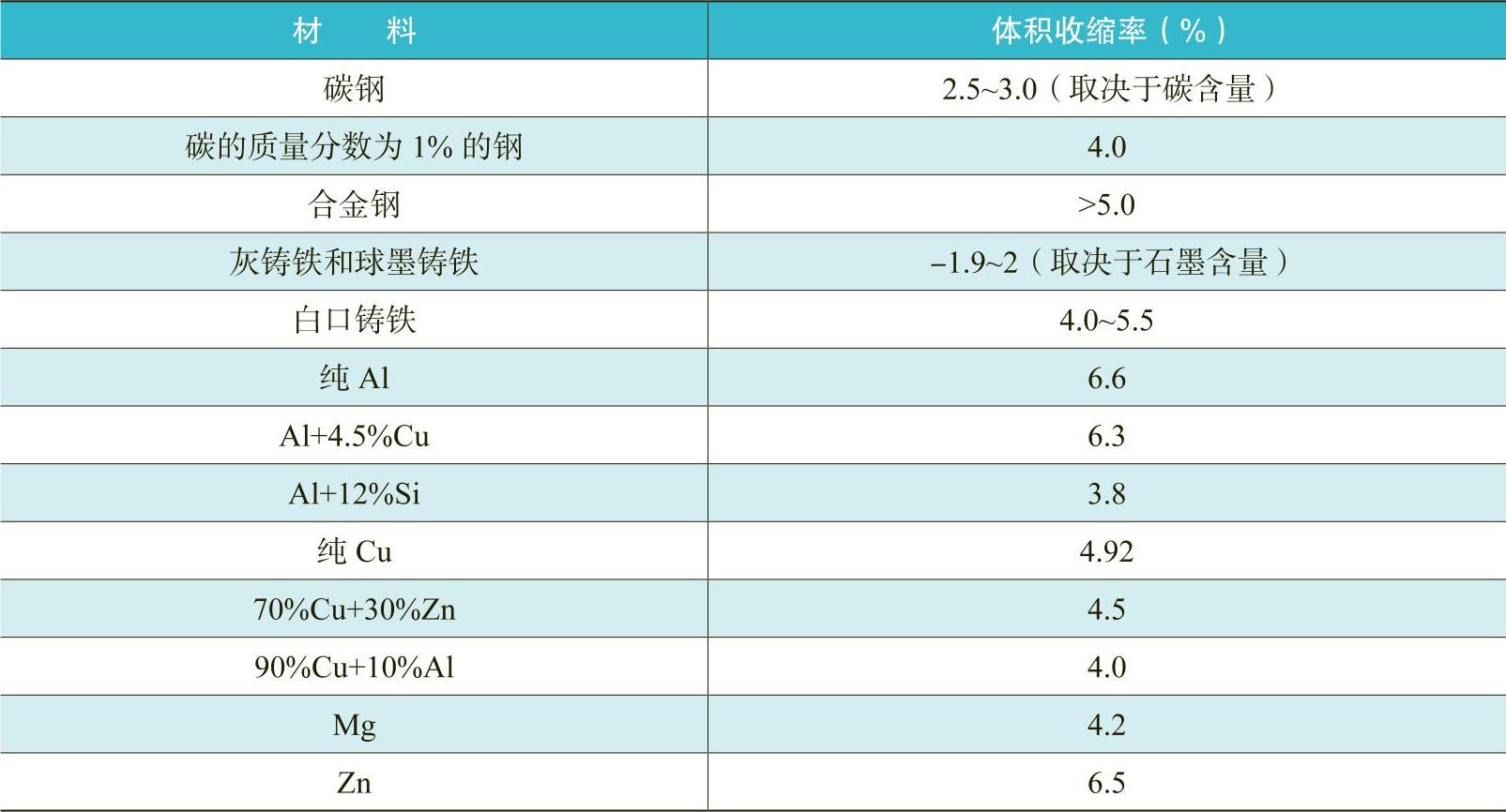 表3-1 常用材料的收缩率(取决于浇注温度)