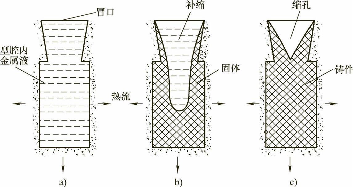 冒口要发挥作用,则要保证在铸件金属不再发生收缩前仍有液态金属与铸件接触。因此,冒口金属要比连接处铸件更晚凝固。球墨铸铁在凝固的最后阶段,金属由于石墨析出而膨胀,则冒口可以在这个阶段断开或凝固。基本上所有的金属都需要冒口,只有一个例外,就是有些球墨铸铁件可以无冒口浇注,这是因为其在凝固过程中没有收缩,如图3-12所示。