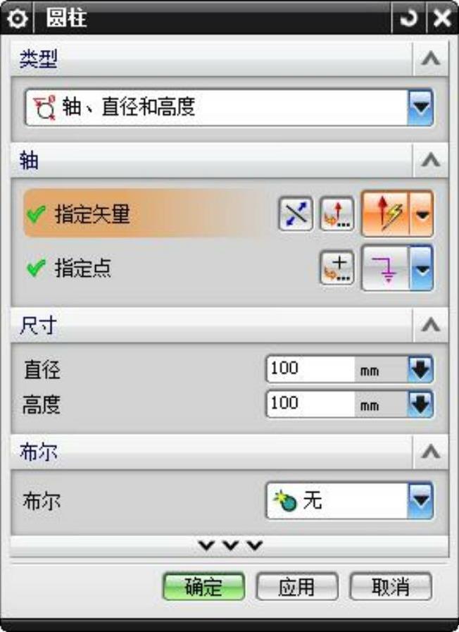定义圆柱体参数。在“圆柱”对话框的 文本框中输入数值 100 ,在 文本框中输入数值 100 。