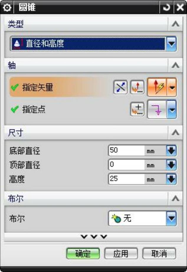 定义圆锥体参数。在 文本框中输入数值 50 ,在 文本框中输入数值 0 ,在 文本框中输入数值 25 。