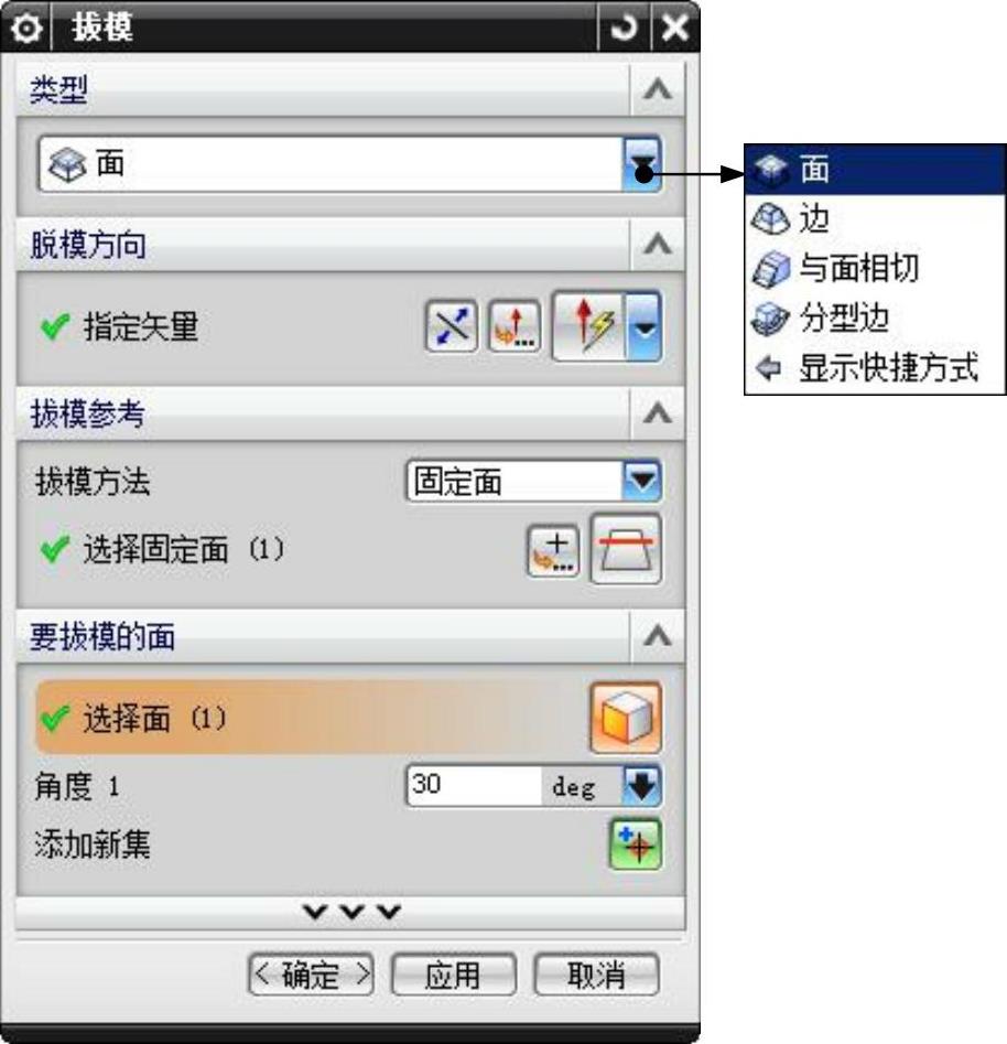 选择拔模类型。在对话框的 下拉菜单中选取 选项。