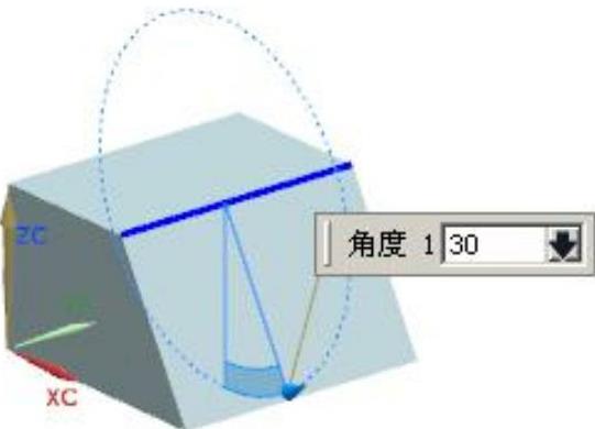 定义拔模角。系统将弹出设置拔模角的动态文本框,输入拔模角度值 30 (也可拖动拔模手柄至需要的拔模角度)。
