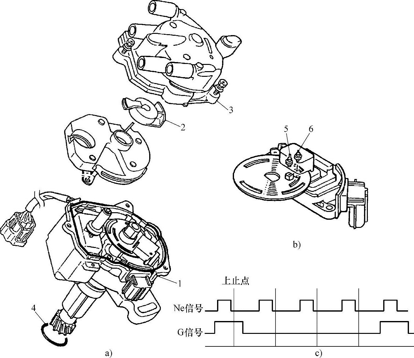 1—曲轴位置传感器 2—分火头 3—分电器盖 4—O形密封圈 5—G信号传感器 6—Ne信号传感器