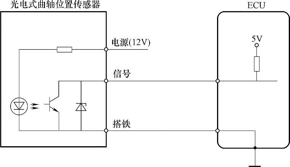 在传感器内部的放大电路中,用光敏晶体管组成一个晶体管开关电路,ECU中的5V基准电压通过一个较大的电阻后施加在晶体管开关电路上(图2-69)。当发光二极管的光线照射到光敏晶体管时,开关电路处于饱和状态,此时传感器的信号输出端与搭铁导通,5V电压经过ECU中的电阻后在该端子处被短路,其电压变为0V;当发光二极管的光线被转子遮住时,晶体管开关电路处于截止状态,使传感器的信号输出端相对于搭铁开路,其电压变为5V。由此可知,和霍尔式曲轴位置传感器一样,光电式曲轴位置传感器的输出信号电压也是通过信号输出端相对于搭铁端导通状态的改变,由ECU施加在该端子上的电压产生的,在传感器转子转动一圈的过程中,传感器输出和转子叶片(或窗口)数目相同的、幅值为5V的矩形电压脉冲信号。
