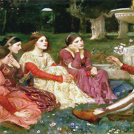 Still in mid heaven, the moon had lost her radiance, nor was any part of our world unillumined by the fresh splendour of the dawn,when, the queen being risen and having mustered her company, they hied them, gently sauntering, across the dewy mead some distance from the beautiful hill, conversing now of this, now of the other matter,canvassing the stories, their greater or less degree of beauty, and laughing afresh at divers of their incidents,until, the sun being now in his higher ascendant, they began to feel his heat, and turning back by common consent, retraced their steps to the palace, where, the tables being already set, and fragrant herbs and fair flowers strewn all about, they by the queen's command,before it should grow hotter, addressed themselves to their meal. So, having blithely breakfasted, they first of all sang some dainty and jocund ditties, and then, as they were severally minded, composed them to sleep or sat them down to chess or dice, while Dioneo and Lauretta fell a singing of Troilus and Cressida.