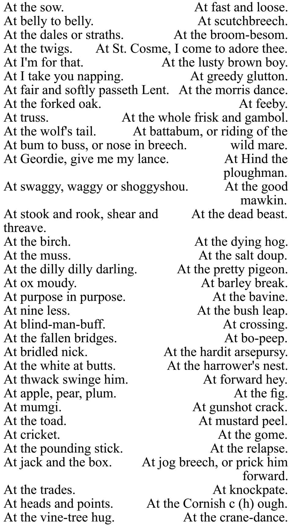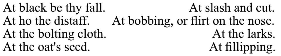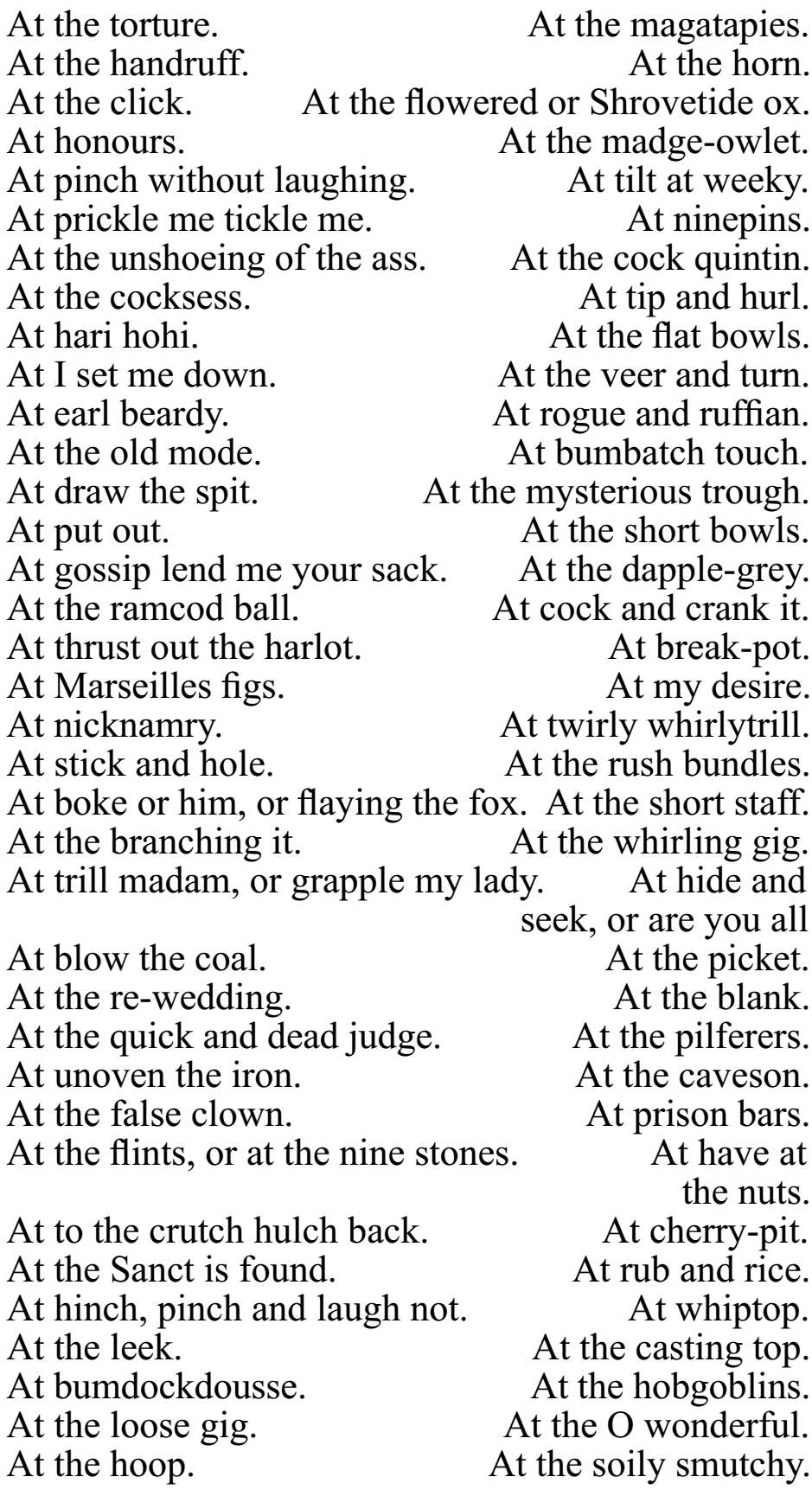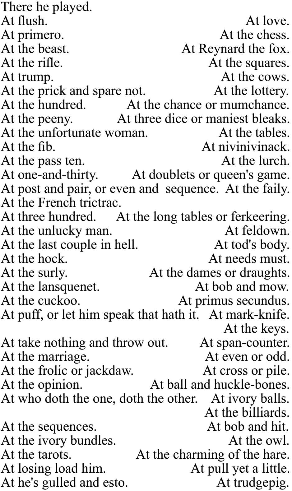 Then blockishly mumbling with a set on countenance a piece of scurvy grace, he washed his hands in fresh wine, picked his teeth with the foot of a hog, and talked jovially with his attendants. Then the carpet being spread, they brought plenty of cards,many dice, with great store and abundance of chequers and chessboards.