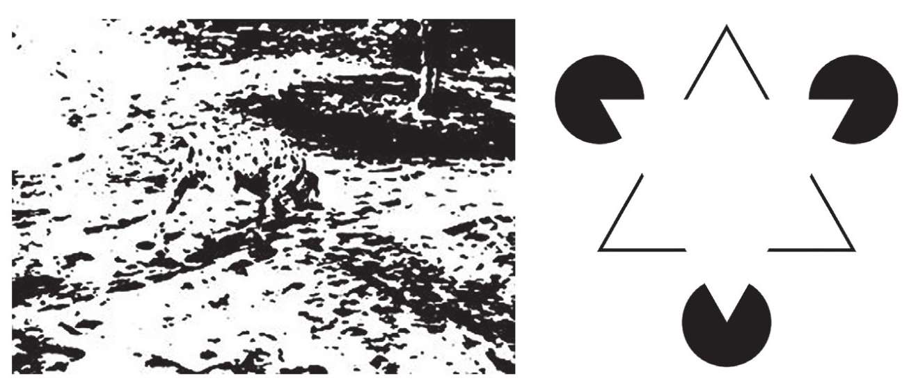 在第一幅插图中,大多数人只看到随机的污点,直到有人告诉他们,画中包含了一条斑点狗,突然之间,几乎所有人的大脑都填补了缺失的边缘,理解了整个构图。这种错觉可以追溯到20世纪60年代,但似乎没有人记录下是谁创造了它。第二幅插图的来历更清楚。它被称为卡尼萨三角,以意大利心理学家盖塔诺·卡尼萨(Gaetano Kanizsa)之姓得名,卡尼萨1955年创建了这一图形。图中其实没有三角形,只不过,大脑为你放了一个。