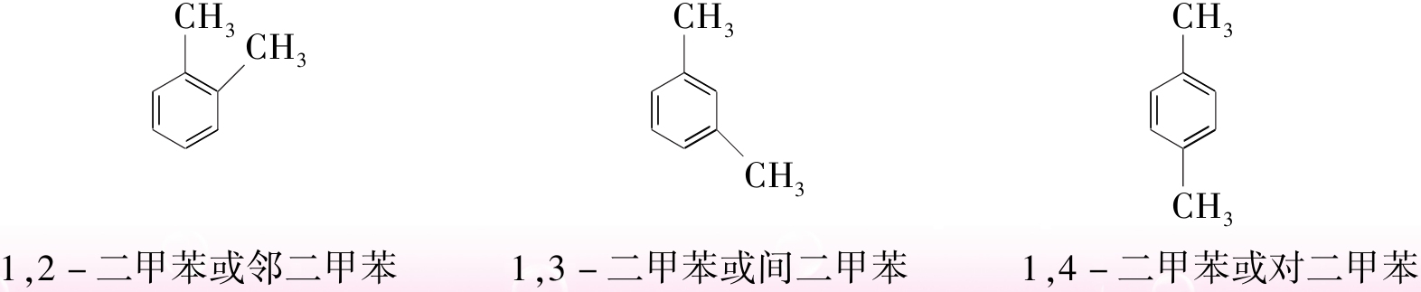 (2)二烃基苯有3种同分异构体,由于取代基在苯环上的位置不同,也称为位置异构。命名时用邻位(或1,2位)、间位(或1,3位)、对位(或1,4位)表示取代基在苯环上的位置。例如,二甲苯的3种位置异构体: