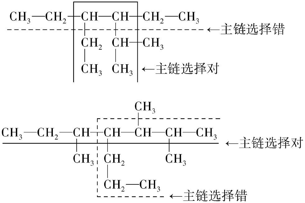 ① 选主链,称某烷。选定分子中最长的碳链(即含有碳原子数目最多的链)为主链,并按照主链上碳原子的数目称为“某烷”。遇多个等长碳链时,则取代基最多的为主链。例如: