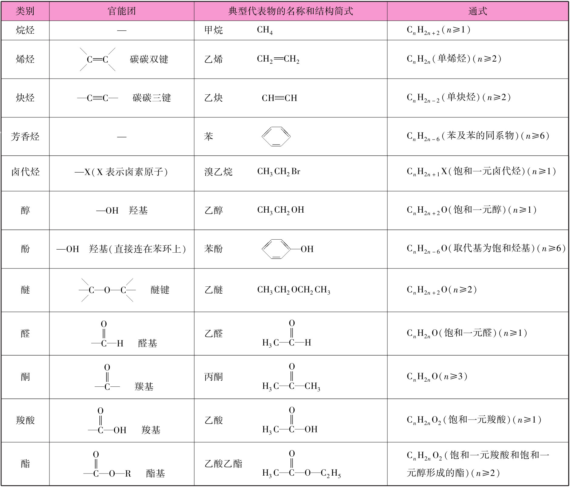 2.官能团指的是决定化合物的化学特性的原子或原子团。例如,卤素原子(—X)、羟基(—OH)、醛基(—CHO)、羧基(—COOH)、硝基(—NO 2 )、酯基(—COO—)分别是卤代烃、醇或酚、醛、羧酸、硝基化合物、酯的官能团。