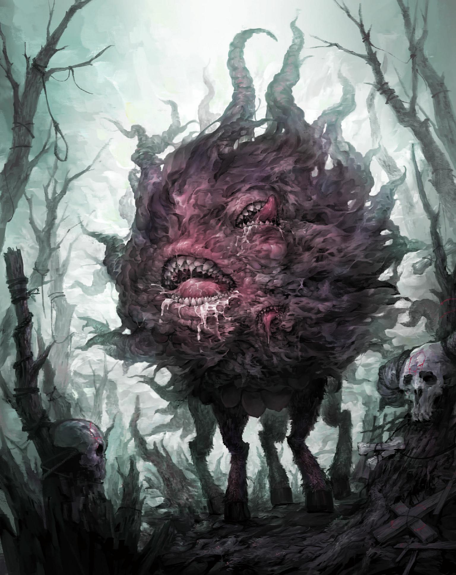 莎布-尼古拉斯特有的眷属种族名为“黑山羊幼崽”。这种生物的整体轮廓像一棵畸形的大树,叫声和羊类似。它们的躯体是一个巨大的团块,上面生满黑色的鞭状触手,多条巨大的蹄足支撑起了整个身躯,团块中心长着布满褶皱的大嘴,不断滴落绿色的黏液。这个形象流传很广,许多流行文化的作品中都有它的身影。