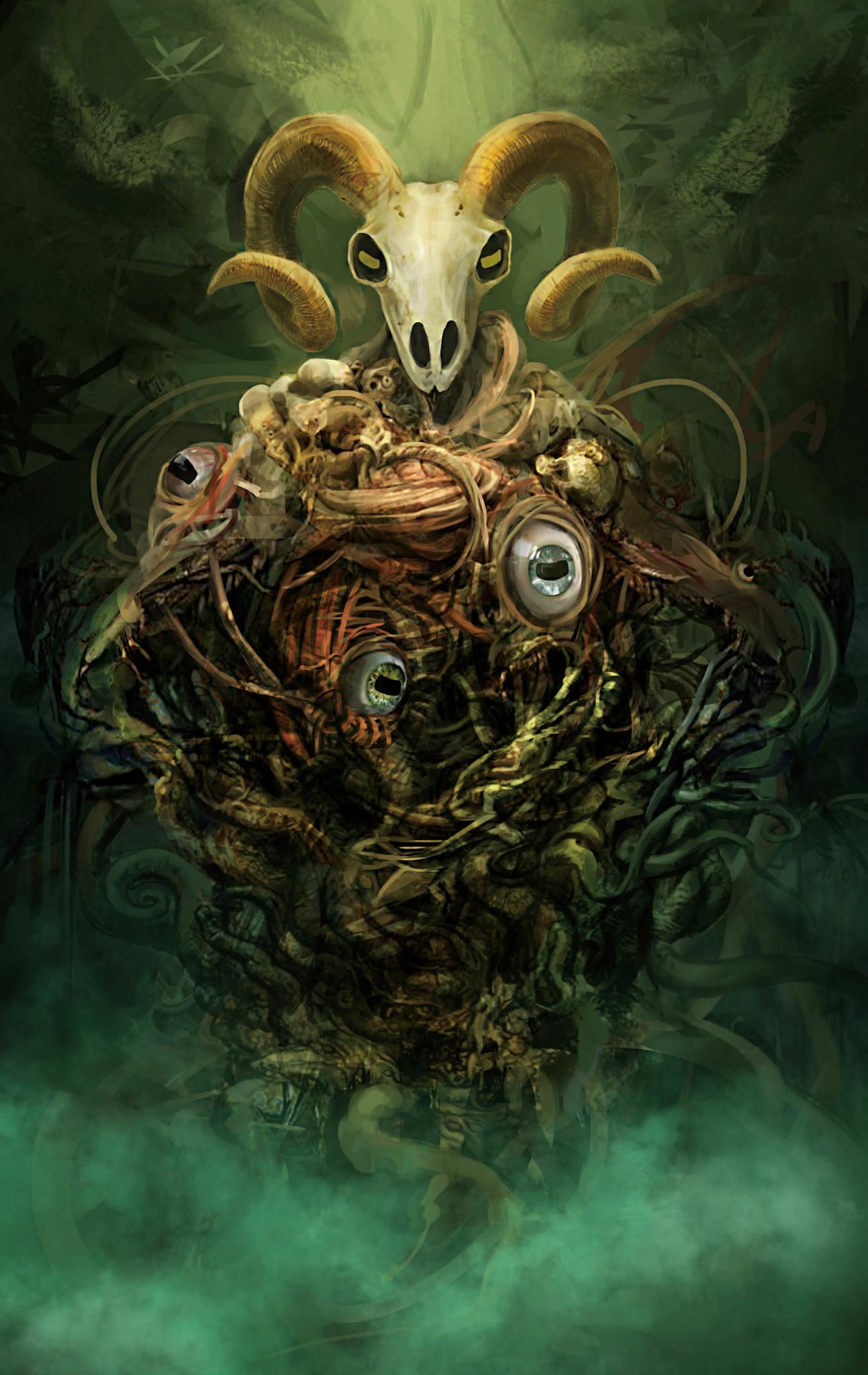 关于莎布-尼古拉斯的具体形象,洛夫克拉夫特仅在信中提过一句“云雾般的存在”。在此基础上,根据丰饶神、生育、山羊等特征,它的形象定型为巨大的黑色云雾状物体,躯体上生着许多长满利齿的大口,还有很多不断伸缩的羊蹄和触手。或许是因为作者在《丘》中称它是“更加复杂的阿斯塔特”,莎布-尼古拉斯被认为是与丰饶、生育等概念有关的神明,可以说是最有普通宗教神明意味的外神。因此,它经常被赋予女性特征,但亚威隆尼的魔法师阿兹达莱克曾经提到一个男性化的称谓——拥有万千配偶的公山羊。《水神克塔亚特》声称外神同时拥有两种性别,但给神明赋予人类概念中的性别属性无疑是愚蠢的。