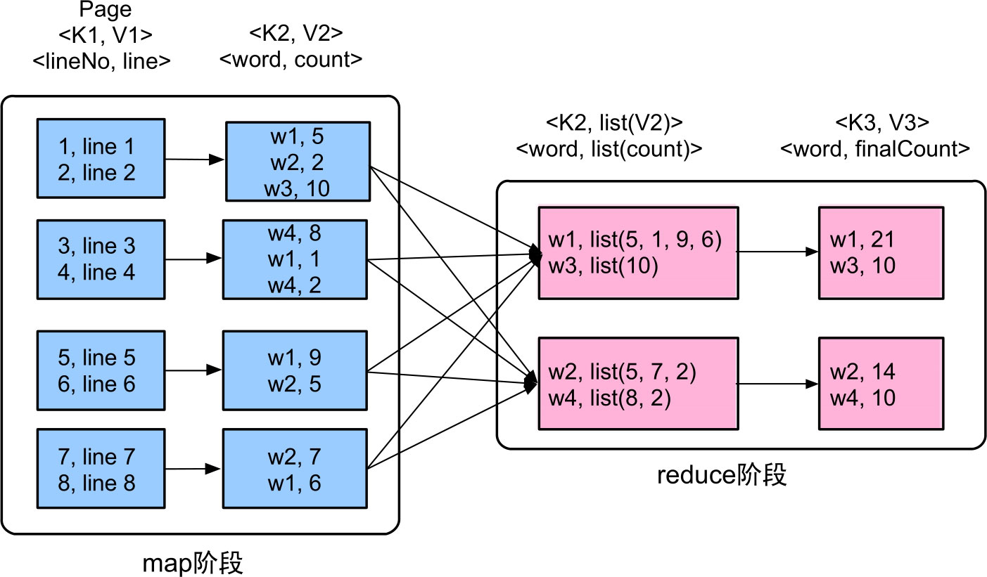在图1.1中,WordCount应用使用MapReduce框架来统计一篇英文文章中每个单词出现的次数。我们首先将文章(Page)按行拆分为多个分块(input split),图1.1中的Page被拆分为4个分块,每个分块有两行,每行包含行号(lineNo)和该行的内容(line)。在map阶段,我们对每一行执行map(K=lineNo,V=line)函数。该函数对line进行分词,并统计line中每个word(w)出现的次数。例如,line 1中包含5个w1和2个w2,就输出两个键值对(record),即<;w1,5>;和<;w2,2>;。在reduce阶段,我们将包含相同词的record聚合在一起,形成<;word,list(count)>;。例如,将多个<;w1,count>;record聚合为<;w1,list(5,1,9,6)>;,之后对list中的值(Value)进行累加,得到并输出<;w1,21>;。