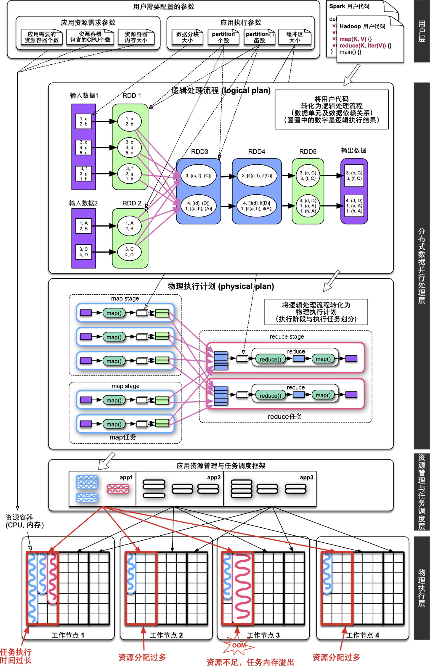 大数据处理框架大体可以分为四层结构:用户层、分布式数据并行处理层、资源管理与任务调度层、物理执行层。以Apache Spark框架为例,其四层结构如图1.2所示。在用户层中,用户需要准备数据、开发用户代码、配置参数。之后,分布式数据并行处理层根据用户代码和配置参数,将用户代码转化成逻辑处理流程(数据单元及数据依赖关系),然后将逻辑处理流程转化为物理执行计划(执行阶段及执行任务)。资源管理与任务调度层根据用户提供的资源需求来分配资源容器,并将任务(task)调度到合适的资源容器上运行。物理执行层实际运行具体的数据处理任务。下面具体介绍每个层次的详细信息,以及工业界和学术界进行的一些相关工作。